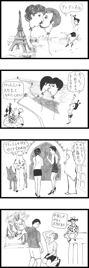 これ尖閣諸島やら竹島やらで、日中韓のしがらみを顔とフランス人絡めて皮肉ったのよ。